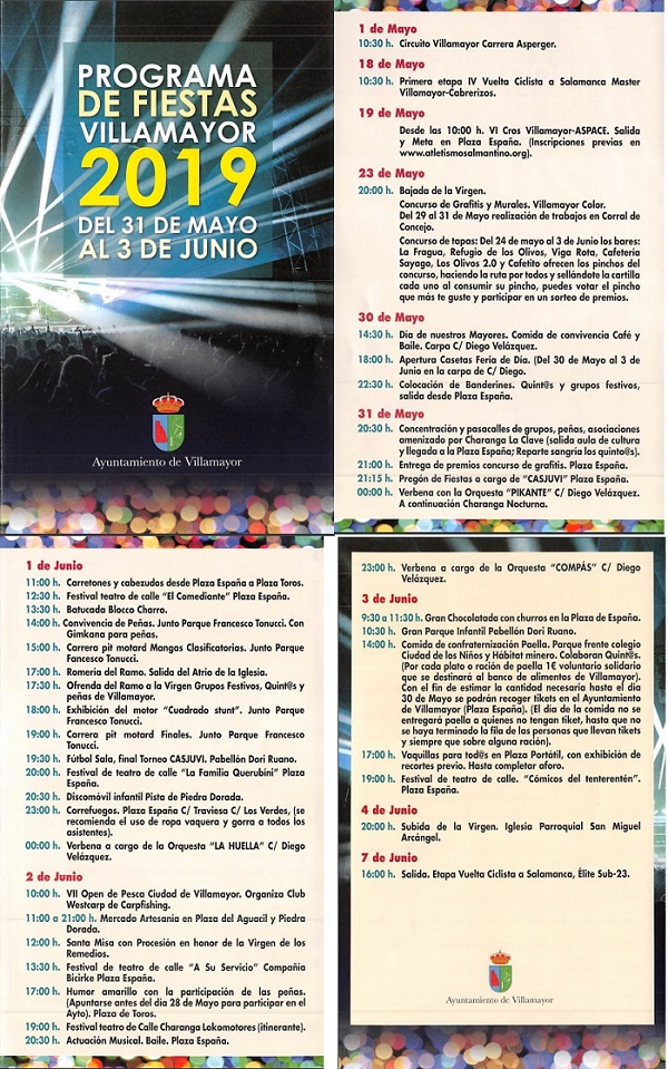 30 de mayo 14:30 h. Día de nuestros Mayores. Comida de convivencia Café y Baile. Carpa C/ Diego Velázquez. 18:00 h. Apertura Casetas Feria de Día. (Del 30 de Mayo al 3 de Junio en la carpa de C/ Diego. 22:30 h. Colocación de Banderines. Quint@s y grupos festivos, salida desde Plaza España. 31 de mayo 20:30 h. Concentración y pasacalles de grupos, peñas, asociaciones amenizado por Charanga La Clave (salida aula de cultura y llegada a la Plaza España; Reparte sangría los quinto@s). 21:00 h. Entrega de premios concurso de grafitis. Plaza España. 21:15 h. Pregón de Fiestas a cargo de ‘CASJUVI’ Plaza España. 00:00 h. Verbena con la Orquesta “PIKANTE” C/ Diego Velázquez. A continuación Charanga Nocturna. 1 de junio 11:00 h. Carretones y cabezudos desde Plaza España a Plaza Toros. 12:30 h. Festival teatro de calle “El Comediante” Plaza España. 13:30 h. Batucada Blocco Charro. 14:00 h. Convivencia de Peñas. Junto Parque Francesco Tonucci. Con Gimkana para peñas. 15:00 h. Carrera pit motard Mangas Clasificatorias. Junto Parque Fancesco Tonucci. 17:00 h. Romería del Ramo. Salida del Atrio de la Iglesia. 17:30 h. Ofrenda del Ramo a la Virgen Grupos Festivos, Quint@s y peñas de Villamayor. 18:00 h. Exhibición del motor “Cuadrado stunt”. Junto Parque Francesco Tonucci. 19:00 h. Carrera pit motard Finales. Junto Parque Francesco Tonucci. 19:30 h. Fútbol Sala, final Torneo CASJUVI. Pabellón Dori Ruano. 20:00 h. Festival de teatro de calle “La Familia Querubíni” Plaza España. 20:30 h. Discomóvil infantil Pista de Piedra Dorada. 23:00 h. Correfuegos. Plaza España C/ Traviesa C/ Los Verdes, (se recomienda el uso de ropa vaquera y gorra a todos los asistentes). 00:00 h. Verbena a cargo de la Orquesta “LA HUELLA” C/ Diego Velázquez. 2 de junio 10:00 h. VII Open de Pesca Ciudad de Villamayor. Organiza Club Westcarp de Carpfishing. 11:00 a 21:00 h. Mercado Artesanía en Plaza del Aguacil y Piedra Dorada. 12:00 h. Santa Misa con Procesión en honor de la Virgen de los Remedios. 13:30 h. Festival de teatro de calle “A Su Servicio” Compañía Bicirke Plaza España. 17:00 h. Humor amarillo con la participación de las peñas. (Apuntarse antes del día 28 de Mayo para participar en el Ayto). Plaza de Toros. 19:00 h. Festival teatro de Calle Charanga Lokomotores (itinerante). 20:30 h. Actuación Musical. Baile. Plaza España. 23:00 h. Verbena a cargo de la Orquesta “COMPÁS” C/ Diego Velázquez. 3 de junio 9:30 a 11:30 h. Gran Chocolatada con churros en la Plaza de España. 10:30 h. Gran Parque Infantil Pabellón Dori Ruano. 14:00 h. Comida de confraternización Paella. Parque frente colegio Ciudad de los Niños y Hábitat minero. Colaboran Quint@s. (Por cada plato o ración de paella 1€ voluntario solidario que se destinará al banco de alimentos de Villamayor). Con el fin de estimar la cantidad necesaria hasta el día 30 de mayo se podrán recoger tikets en el Ayuntamiento de Villamayor (Plaza España). (El día de la comida no se entregará paella a quienes no tengan tiket, hasta que no se haya terminado la fila de las personas que llevan tikets y siempre que sobre alguna ración). 17:00 h. Vaquillas para tod@s en Plaza Portátil, con exhibición de recortes previo. Hasta completar aforo. 19:00 h. Festival de teatro de calle. “Cómicos del tenterentén”. Plaza España. 4 de junio 20:00 h. Subida de la Virgen. Iglesia Parroquial San Miguel Arcángel. 7 de junio 16:00 h. Salida. Etapa Vuelta Ciclista a Salamanca, Élite Sub-23
