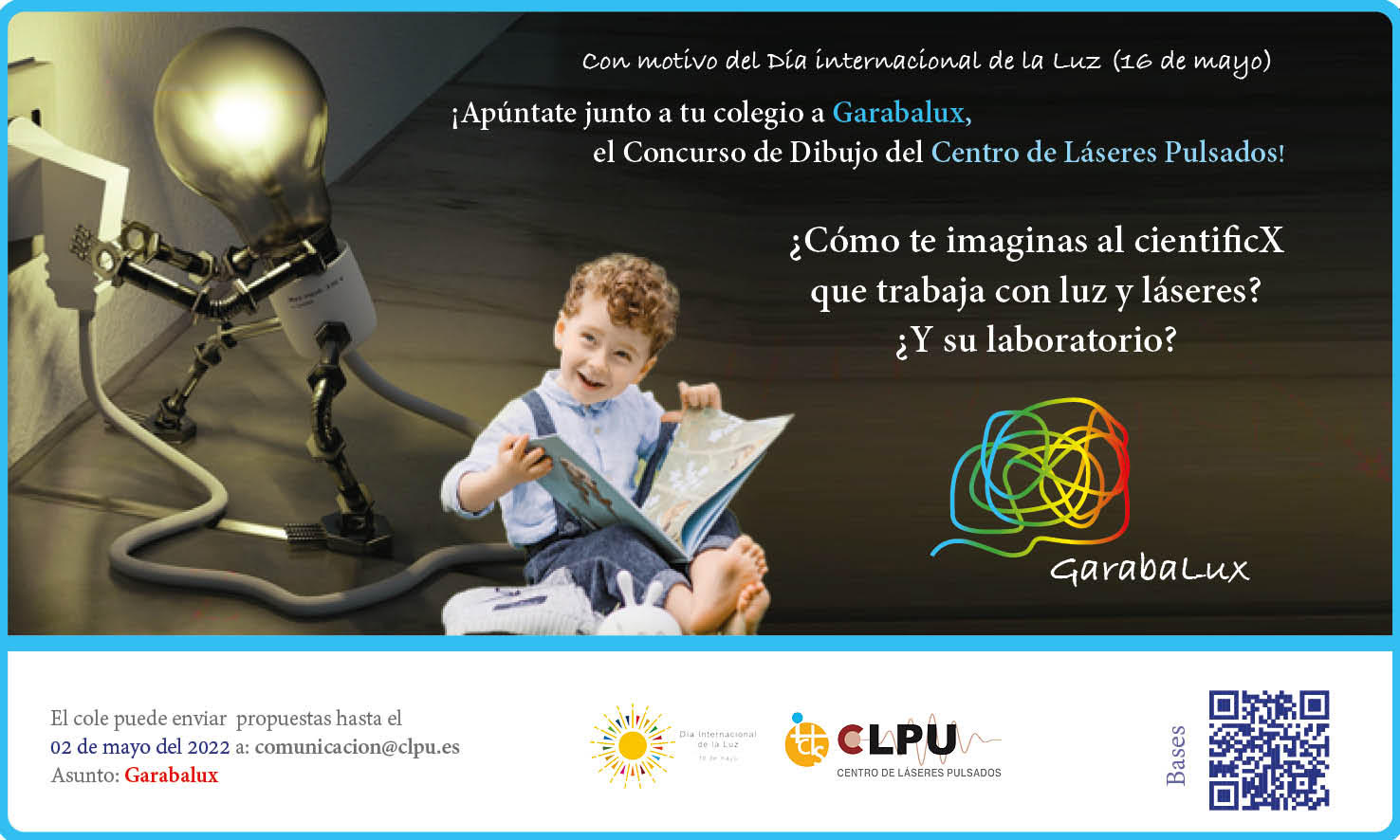 El CLPU lanza la segunda edición de su concurso de dibujo Garabalux Salamanca, 25 de enero de 2022. Con motivo del Día Internacional de la Luz, el próximo 16 de mayo, el Centro de Láseres Pulsados lanza la segunda edición de su concurso de dibujo Garabalux para alumnos de Primaria de la provincia de Salamanca. Todos los alumnos de 1º a 6º de educación primaria de la provincia de Salamanca podrán participar a través de sus colegios con obras originales en la que nos enseñen cómo se imaginan al científico que trabaja con luz y láseres y cómo piensan que es su laboratorio. Como en su primera edición, el concurso cuenta con dos categorías: Garabalux 1 (para los estudiantes de 1º a 3º) y Garabalux 2 (de 4º a 6º). Se pueden enviar las propuestas hasta el 02 de mayo al correo comunicacion@clpu.es. El fallo del jurado se dará a conocer el 16 de mayo y posteriormente se procederá a la entrega de premios. Los premios irán dirigidos tanto a los ganadores como a los finalistas de cada categoría y a los centros educativos de los alumnos ganadores. Para más información y descargar las bases: https://www.clpu.es/Garabalux2022_Bases El Día Internacional de la Luz es una iniciativa global que promueve una celebración anual para potenciar el conocimiento que la sociedad tiene del papel crucial que la ciencia de la luz y las tecnologías de la luz representan en el mundo actual. El Centro de Láseres Pulsados una vez más vuelca su mirada sobre los más pequeños e incita a una reflexión sobre la figura del físico especializado en láseres. Muchas de las actividades divulgativas promovidas por la infraestructura se centran en la vocación científica de los estudiantes desde Infantil a Secundaria, por eso conocer qué piensan, creer saber o imaginar resulta fundamental para elaborar nuevas actividades. “Queremos aprender cómo nos ven para poderles explicar mejor cómo somos”, afirma la responsable de comunicación del Centro. El Día Internacional de la Luz se celebra el 16 de mayo de cada año en conmemoración de la primera emisión de luz láser el 16 de mayo de 1960 obtenida por Theodore Maiman con un láser.