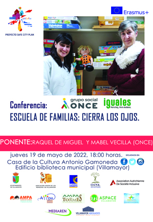 Jueves, 19 de mayo de 2022, a las 18 horas. Casa de la Cultura Antonio Gamoneda. Salón de Actos del Edificio de la Biblioteca 2ª Planta, Villamayor. Conferencia impartida por Raquel de Miguel y Mabel Vecilla del Grupo social ONCE. Esta conferencia está dentro del proyecto europeo SAFECITYPLAN que tiene como objetivo trabajar en primer lugar directamente con las familias los valores comunes como la convivencia, y desde las familias potenciar la participación ciudadana para lograr ciudades y países seguros, en colaboración con los centros educativos y las autoridades locales. Otro objetivo es crear una ESCUELA DE FAMILIAS para formar a los padres/madres. Los socios europeos participantes son de Austria (Federación de Madres y Padres de Wien), de Grecia (Asociaciones de Volos) y del Reino Unido (Cumbria Credits Limited de Carlisle), la Asociación Virgen de los Remedios de Villamayor y el Ayuntamiento de Villamayor que es el coordinador del proyecto. CURRÍCULOS DE LAS PONENTES: RAQUEL DE MIGUEL RUANO Trabajadora Social de ONCE SALAMANCA Técnico del Servicio de Voluntariado ONCE SALAMANCA MABEL VECILLA RODRIGO Maestra educación infantil y psicopedagoga por la USAL Psicomotricista por la UPSA Formadora ONCE y CFIE en áreas específicas de Discapacidad Visual y Educación 35 años formando parte de los equipos específicos educación ONCE (CyL y antes Extremadura) Aprendiz de toda la vida