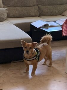 Lo llevamos con nosotros cuando vamos de vacaciones y lo sacamos tres veces al día: por la mañana antes de que Marisol se vaya a trabajar, luego a mediodía lo sacamos otro poquito y luego por la tarde lo saco yo vaya donde vaya. Siempre está conmigo. Sólo protesta un poco cuando tiene hambre y cuando está malito.  Da gusto con él. Es un sol, como indica su nombre (Sunny)